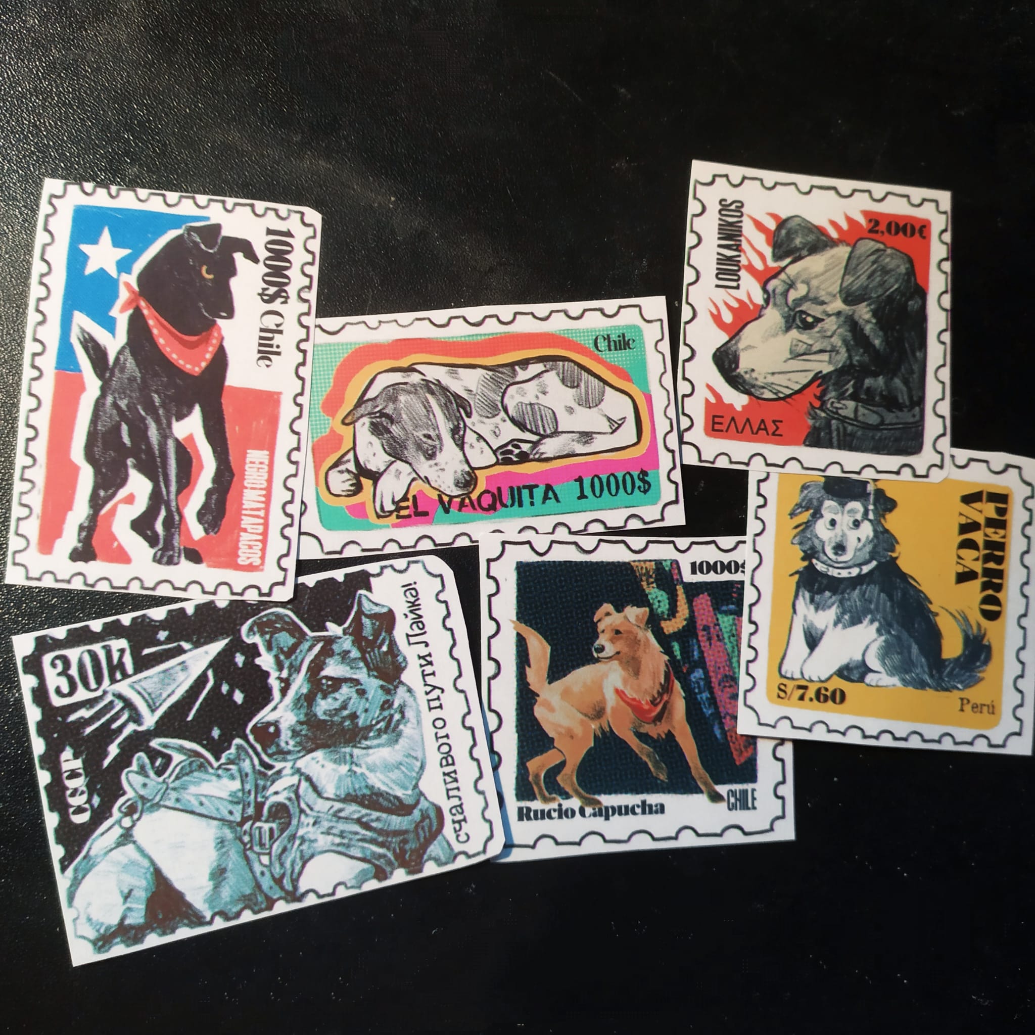 These are not real stamps, just stamp-like illustrations I made of famous protest dogs (and Laika), so they can be used for decoration but not to send letters, of course. Splash resistant but not weatherproof, meant for interior use.